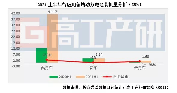 从装机量应用领域来看,上半年新能源乘用车领域装机约41.17GWh,同比增长234%;新能源客车领域装机约3.54GWh,同比下降1%;新能源专用车领域装机约1.68GWh,同比增长93%。