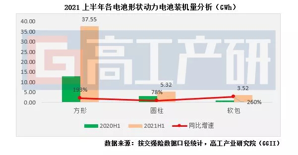 从不同电池形状来看,2021上半年方形动力电池装机量约37.55GWh,同比增长193%;软包动力电池装机量约5.32GWh,同比增长78%;圆柱动力电池装机量约3.52GWh,同比增长260%。
